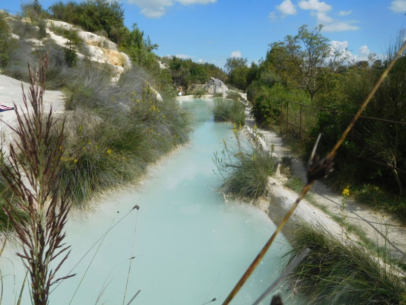 Doordat de weg naar Pienza, ons eerst doel vandaag, afgesloten is moeten we via de 53 rijden en dat was niet verkeerd want zo komen we langs wederom twee bezienswaardigheden waar we geen weet van hadden. Eerst Bagno Vignone, (2x onder) net als cascatta Mulina een warmwaterbad dat ook zout terrassen verschaft maar dan toch iets anders. Het water is hier een stuk minder warm maar toch lekker om er te vertoeven.